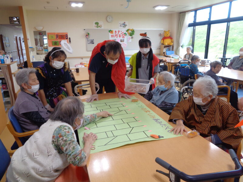 今年度はハロウィンあみだくじを行い、いつもはベットで横になっている方も参加され、とっても素敵な笑顔をみせてくださっています。